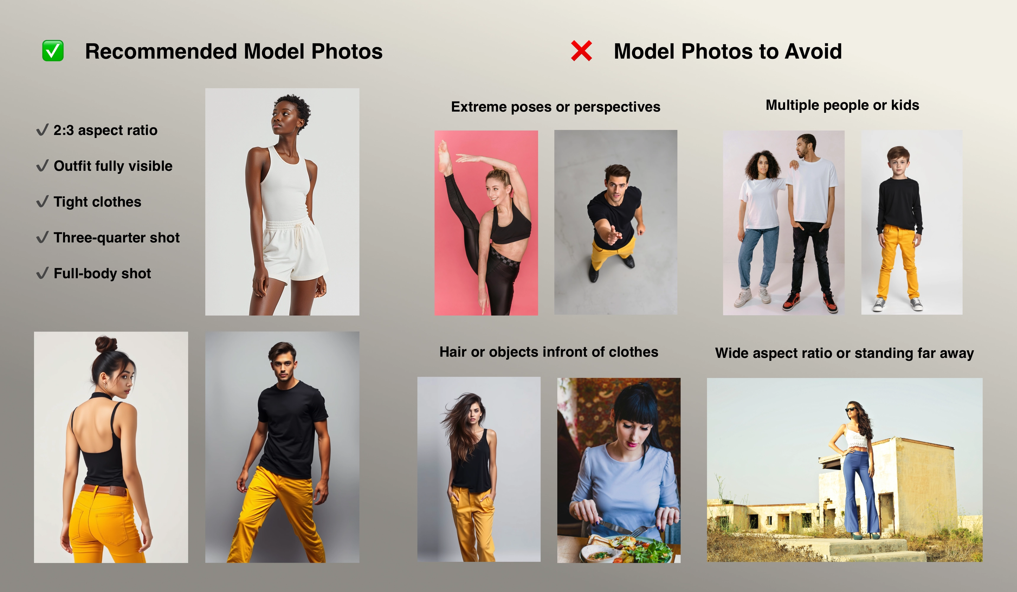 PoseError | The pipeline was unable to detect a body pose in either the model image or the garment image (when garment_photo_type: "model"). | Improve model or garment photo quality following the model photo guidelines. |